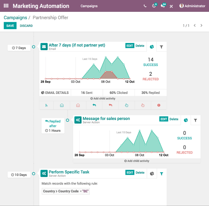 Automatizar todas estas funciones es muy fácil con Odoo, las aplicaciones de Automatización de Marketing, Marketing por Email, Redes Sociales se integran con el resto.